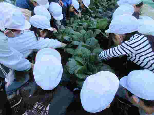 とても立派な小松菜がたくさん収穫でき、中には白菜ぐらいの大きさの小松菜もありました!収穫した小松菜は調理員さんたちがサラダにしてくださり、全校児童で美味しくいただきました。